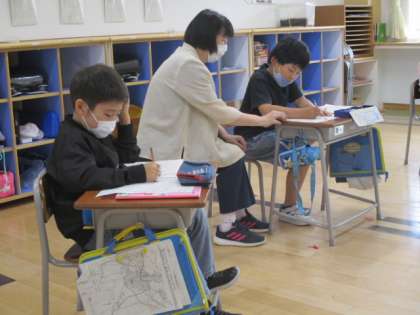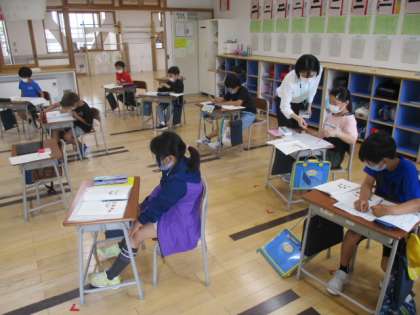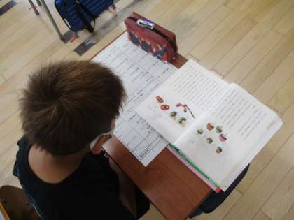 3年生の1時間目は国語の授業でした。この授業では教科書の「こまを楽しむ」の文章について、第4段落と第5段落の内容理解を進めました。担任の先生が準備しておいたプリントにそって、内容を読み取っていきます。教科書をよーく見て、読み取ってくださいね。