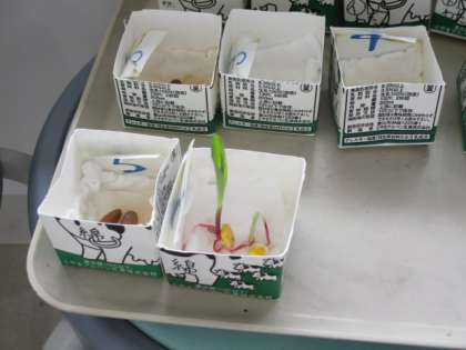 5年生が育てている豆の芽が、どんどん伸びてきました。