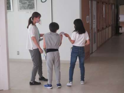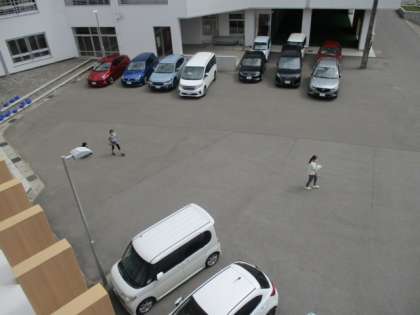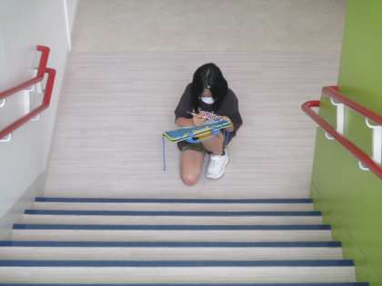 それぞれが選んだ場所はバラバラです。校舎内もあれば校舎外もあります。時間が限られていますからそんなにゆっくりはしてられません。階段の下を選んだ人は、さっそく描き始めました。