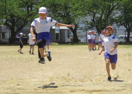 5年生の3時間目は体育の授業でした。今日取り組んだのは走り幅跳びでした。踏み切る際に高く跳ぶことを意識しました。写真からは高さが増したように見えます。