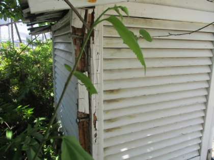 写真上・中 : 壊れかけた古い百葉箱