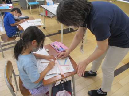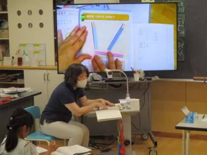 2年生の3時間目は算数の授業でした。「長さをくらべてみると?」という教科書の内容を学習しました。教科書には3本の鉛筆が描かれていますが、そのどれが長いのかを、これまた教科書に付いている紙製のもの差しを使って比べます。横に並べて比べるのではなく、3本を数で表して比べるところに学習の大切なところがあります。