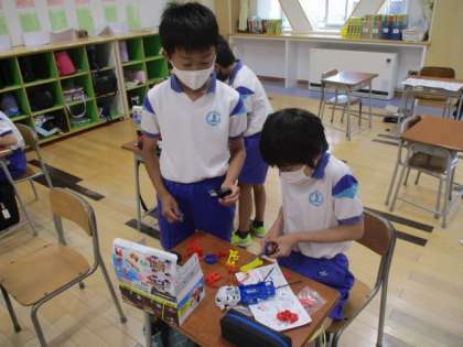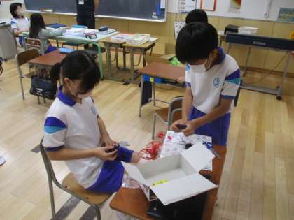 2時間目に4年生教室をのぞくと、理科の「電気のはたらき」で使った模型の工作をしていました。