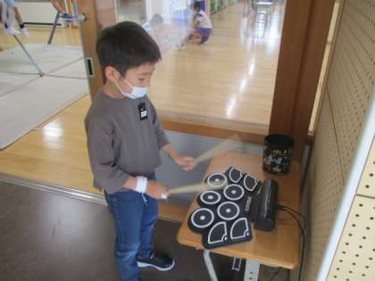 写真上 : ゴム製のドラムをたたいていました。