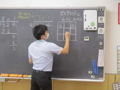 4年生の2時間目は算数の授業でした。授業の前半は「まちがいはどこかな?」という課題で、わり算の筆算についてそのミスを見つけ出す学習内容でした。ここでは、わり算の基本である「(わる数)>(あまり)}についても再確認しました。