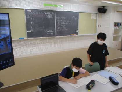 音楽室に集まったのは集会委員会です。今日の委員会では、今朝行ったミュージックタイムの反省と、6月8日(水)に予定している次回のミュージックタイムの役割分担をしました。まず、集会委員会ではミュージックタイムを「MT」と呼んでいたことを知りました。また、今日の反省としては、声の大きさ(が小さかった)、ポーズ(がうまくいかなかった)、(せりふを)最初は覚えていた 等々があがっていました。