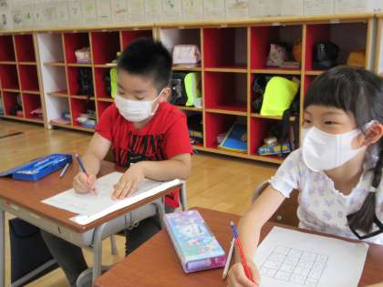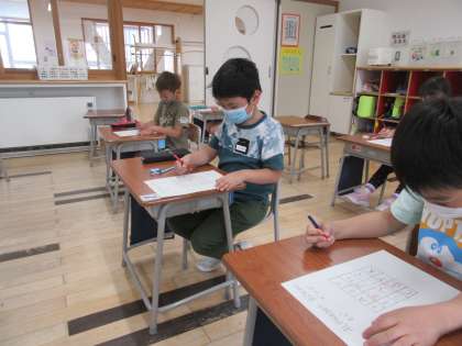 今日は、2週間に1回の外国語活動の日でした。前回教えてもらったアルファベットを使って、ビンゴをしました。「ビンゴ!」と元気に言う姿が微笑ましかったです。