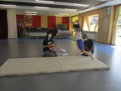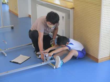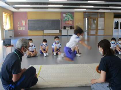 1年生も今朝は「さわやか体育」でした。1年生が取り組んだスポーツテストは、長座体前屈と立ち幅跳びです。立ち幅跳びでは大台の1mを超える児童もいました。