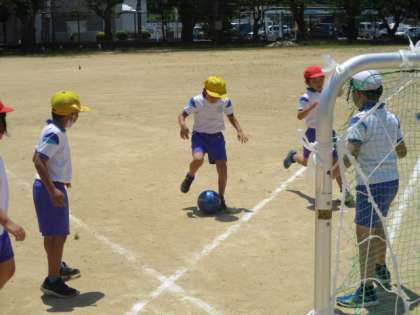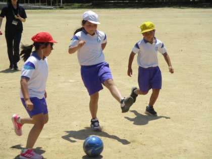 3年生の4時間目は体育の授業でした。今日もグラウンドに出てサッカーです。気温の上昇が心配されましたが、湿度が低く風もあったことから問題なくサッカーが実施できました。