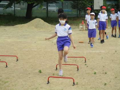 今朝の「さわやか体育」で4年生が取り組んだ種目は、走り幅跳びでした。前半はミニハードルを使ったトレーニングで、後半は高いジャンプを意識する様に、ハードルなどを置いて実際に跳ぶ練習でした。