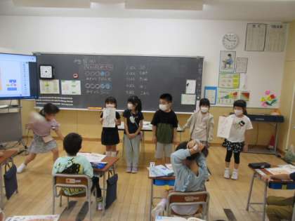 1年生の2時間目は算数の授業でした。今日の学習では、「みぎから○○ばんめ」とか「ひだりから○○人」という言い方を習いました。