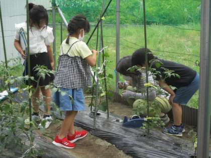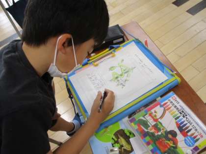 2時間目の2年生は生活科の授業で、学級菜園の夏野菜を観察に行きました。植えた時の苗はとても小さかったのですが、今では写真の通り大きく育ちました。「実を12個つけたよ!」という児童もいました。観察で描いたスケッチは、教室に戻って色を付けをしました。