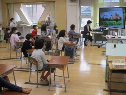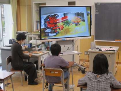 今朝は、上学年のお話会がありました。教室を訪れた時には、天狗の絵が目に入ってきました。