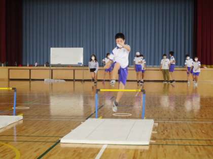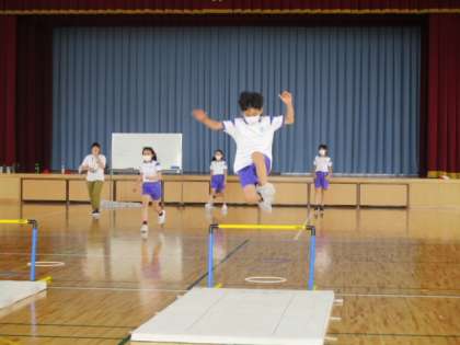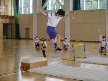 6年生は以前からこの練習をしていたので、空中での高さも段々高くなってきました。また3枚目の写真にあるように、跳び箱で踏み切り、空中姿勢を確かめる練習も新たに取り入れました。
