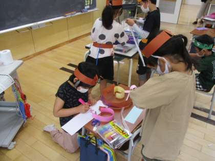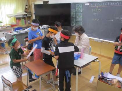 4時間目の2年生は、紙を使って工作をしました。以前に紹介した「ニャンコヒーロー」や「忍者」も装備を更に充実させました。腕にまいた物について聞いてみると、「これはバリアーなの」と教えてもらいました。本当に楽しそうです。