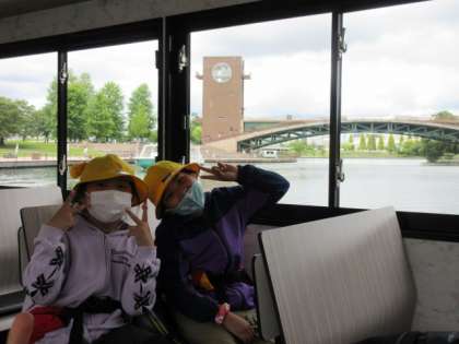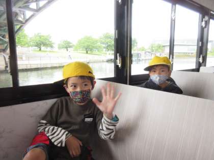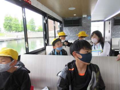 6月7日(火)富岩運河水上ライン(3年生) 公開日 2022/06/07 更新日 2022/06/07 3年生 岩瀬カナル会館から環水公園まで、富岩運河水上ラインに乗りました。 船の中で、富山港に寄港した大きな船がたくさんの車や鉄くずを外国へ運んでいること、富岩運河の周りに工場があることなどを教えていただきました。 おなかがすいた子供たちは、お弁当を食べたくてたまらない様子でした。