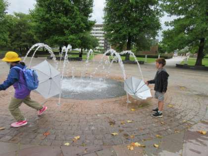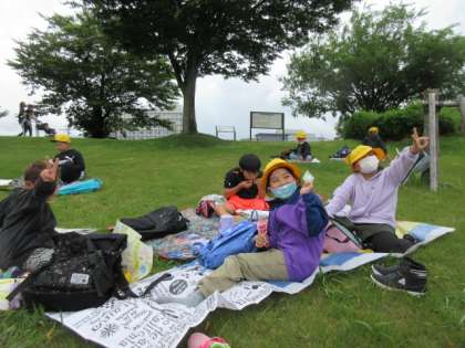 6月7日(火)環水公園(3年生) 公開日 2022/06/07 更新日 2022/06/07 3年生 環水公園に到着し、待ちに待ったお弁当タイムです。幸い雨は降っておらず、芝生の上でお弁当を食べました。その後、おにごっこをしたり、噴水の周りで遊んだり、天門橋に上ったりと、自由時間を過ごしました。
