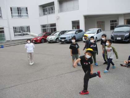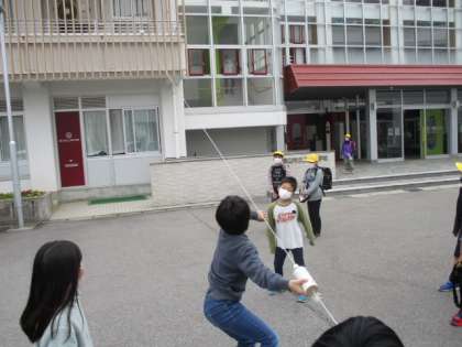 さっそく設置してみると、登校時だったにも関わらずたくさんの児童が集まってきました。ひもの抵抗もあって、一見して当たりそうでもそううまくいかない様です。夢中になって楽しみながら投げる力を強化できそうです。また。この装置は一人では使えず、誰かに手伝ってもらう必要があります。子供の「もっとやりたい」という気持ちと互いに譲り合う気持ちの葛藤が、「折り合いを付ける」いい経験になっていると感じました。