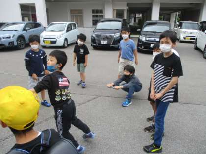 これは、穴を開けたペットボトルにひもを通し、高さ5m程度の壁に固定した的(灰皿)めがけて投げる物です。今取り組んでいる運動能力のうち「投」にあたります。