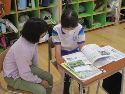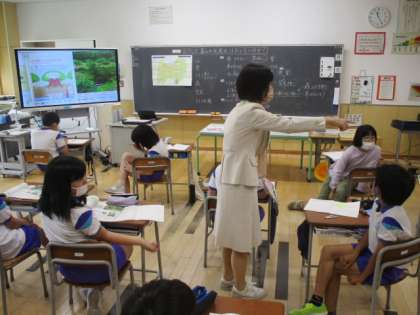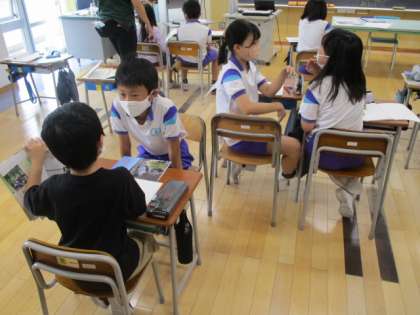 3時間目の4年生は社会科の授業でした。この授業の学習課題は「どうして富山の水道水はおいしいのか」で、山や雪、川、森、空気、浄水場等の視点から考えを深めていきました。そして授業の後半には、2人ペアをつくって森の働きについて意見交流を行いました。
