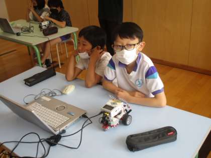 1時間目の5年生を見に行くと、模型の車を見ながら講師の先生からの説明を聞いていました。この後は、PC上でプログラムを作り実際に車を動かします。うまく動くでしょうか。