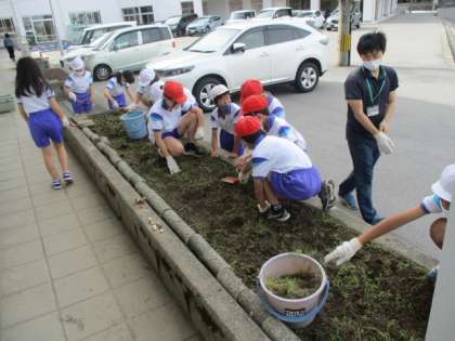 今朝の克己タイムの時間を使って、4年生が学年花壇の整備をしていました。実はどの学年も花壇の整備をして、新しく花を植える予定なのです。