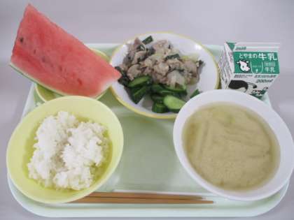 今日の給食献立は、ご飯、牛乳、豚肉の塩こうじ炒め、キュウリもみ、みそ汁、スイカ でした。