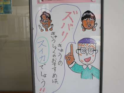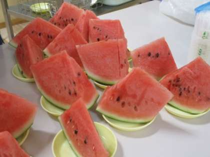 今日の給食の話題は何をおいても「スイカ」です。配膳の際にも、何人もの児童が「大きい!大きい!」と喜んでいました。私にとっては今年の「初もの」でしたが、大きくて甘くてとっても嬉しかったです。