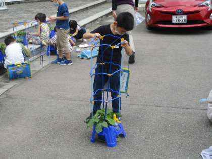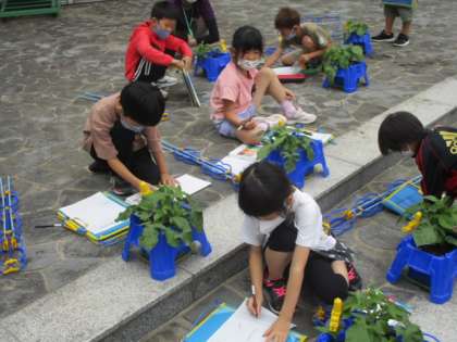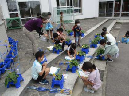 1年生の2時間目は生活科の授業でした。この授業では大きく育ったアサガオを観察した後、支柱を付けます。今後も毎日水やりをしていきますから、アサガオさんにはもっともっと大きく育ってほしいと思います。