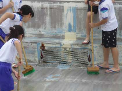 プール清掃の最中、管理職でプール排水口の柵を点検しました。排水口の柵が外れることがあると、狭い配水管に子どもが吸い込まれる危険があります。今日の点検では柵を留めているネジが緩んでおらず、柵がしっかり固定されていることを確認できました。
