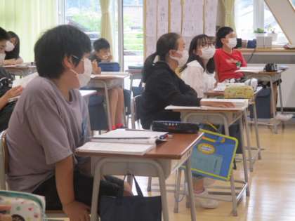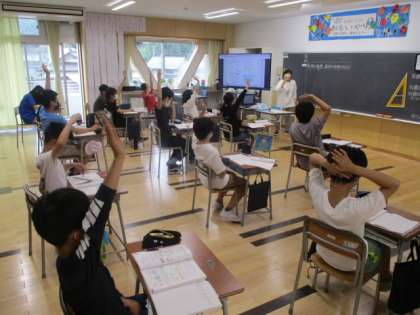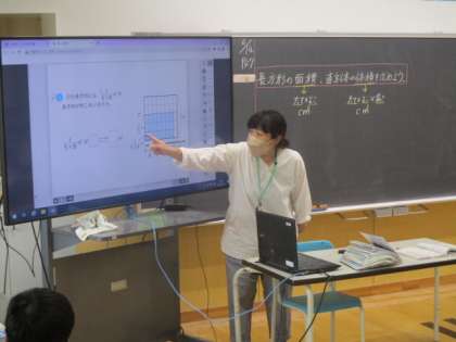 6年生の5時間目は算数の授業でした。この時間には直方体の体積を求めますが、縦、横、高さに分数が入ってきて、以前の問題より解くのが難しくなっています。分数の計算では約分をうまく使って、計算ミスがないようにしていきましょう。
