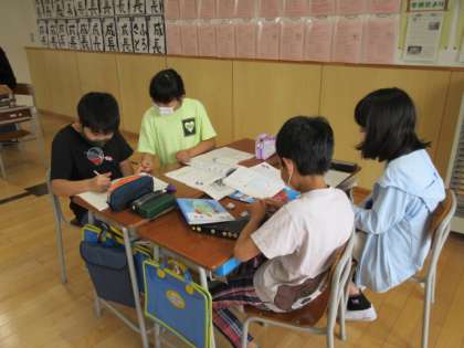 5年生は、小数の割り算の復習をしています。グループの友達に分からないことを教えてもらいながら、取り組んでいます。みんなで勉強すると楽しいですね。
