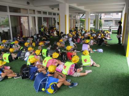 今日は全校の授業を5時間目までとし、ピロティで下校ルート毎に集まってから帰りました。この目的は2つあり、1つは下校時の緊急事態発生時、どこへ助けを求めればいいかを学ばせるためであり、もう1つには、子供たちと一緒にルートの危険箇所を把握するためです。