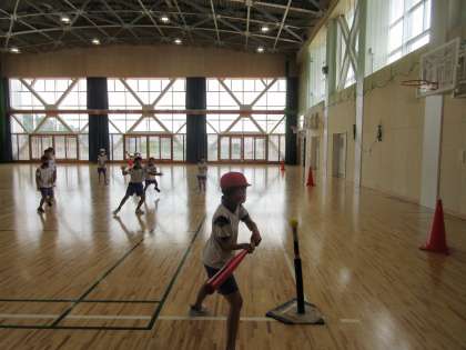 今日から、「ボールうちゲーム」を始めました。初めて取り組んだゲームなので、今日の目当ては「ルールを覚える」です。攻めるときは、ボールをしっかりとバットで打って走ること、守るときは、ボールを拾ったら直ぐに集まって座ることをがんばりました。試しの試合をすると、見直したいルール等も見えてきました。これから、試合をしながら、ボールを打つこと等の技能面と、仲間と協力することや作戦を考えること等の思考面が高まっていってほしいと考えています。