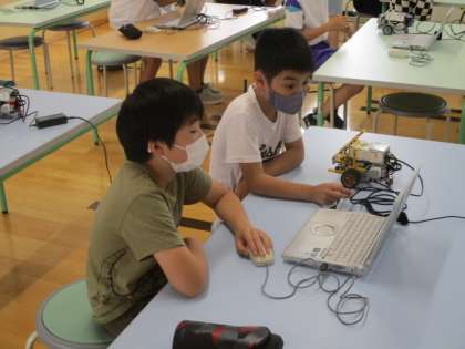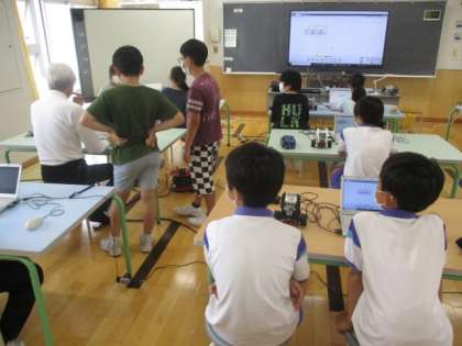 6年生は3・4時間目に「プログラミング出前授業」の2回目を受けました。前回同様、ロボットの動きを制御していきますが、コース上を実際に動かしてみて問題点を修正していく過程は、正に「トライ&エラー」の連続です。それだけに、プログラムが正しくロボットが思い通りの動きをしてくれるとその達成感はとても大きいです。