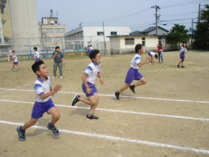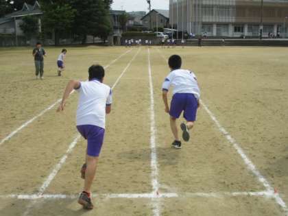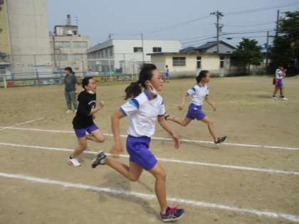 ソフトボール投げの練習を終えると、6年生は「走」の練習にも加わりました。50mを2本ほど走り終わった後でも「もう1本(お願いします)」と担任の先生に願い出ている姿を見て、力強いパワーを感じました。