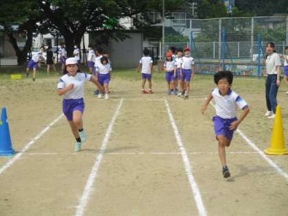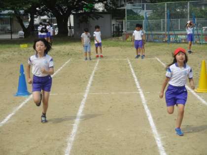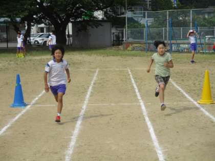 4年生の今日は、「走」の練習です。練習前半は、スタートから15m程を重点的に練習しましたが、その時のポイントは前傾を保つことでした。最後に行った50m走でも、前半に意識をして走りました。