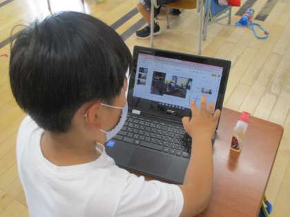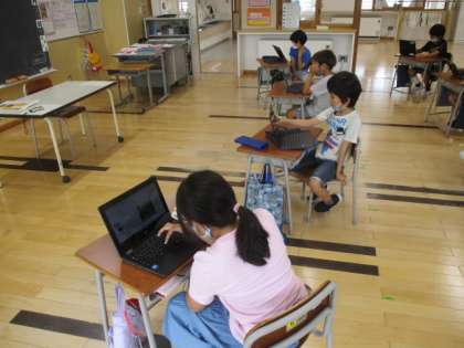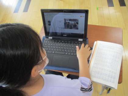 2時間目の3年生は社会科の授業でした。この学習では、以前に校外学習へ出かけた岩瀬について、プレゼンテーションソフトを使って紹介資料を作っています。どの児童も、写真を貼ったりするのは上手そうですが、どうやって文字を入力するのかを見ていたところ、説明の表を見ながらローマ字入力をする児童(写真中)がいたり、手書き入力をしている児童(写真下)がいたりしました。