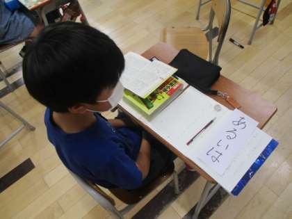 4年生の4時間目は国語の授業でした。「つなぎ言葉を使って文を作ろう」という学習課題で、画用紙に書かれた様々な「つなぎ言葉」をくじ引きのように引き、実際にその言葉を使って文を作ってみました。写真の3人はそれぞれ、「また」「あるいは」「それとも」を引いたようです。写真にはありませんが、中には「なんでも」と書かれた紙が混ぜられており、その場合は「なんでも」という言葉を使うのではなく、好きな「つなぎ言葉」は「なんでも」使っていいということのようです。