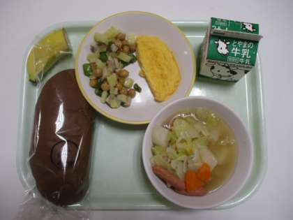 今日の給食献立は、ココアコッペパン、牛乳、チーズオムレツ、ひよこ豆のオリーブオイル炒め、ポトフ、バナナ でした。今日は湿気もある暑い日ではありましたが、思った以上に温かいポトフをおいしく感じました。