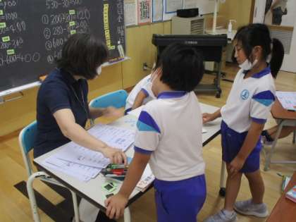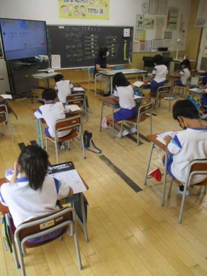 2時間目の2年生は算数の授業でした。この授業では、3ケタまでの数を含む足し算・引き算のたしかめをしました。「130−60」を間違えている児童もいましたが、「13−6の答えは?」とアドバイスをすると、すんなりと正解を求めることができました。
