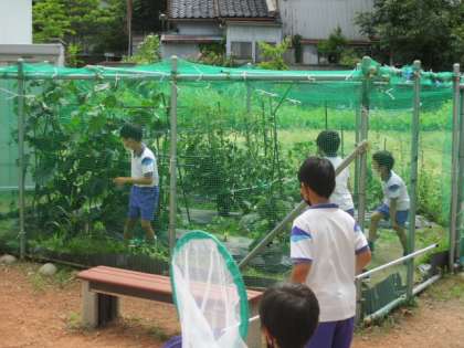 また授業後の休み時間には、学級菜園のネットの中にスズメが数羽進入していたので、ネットの中から外へ逃がしました。