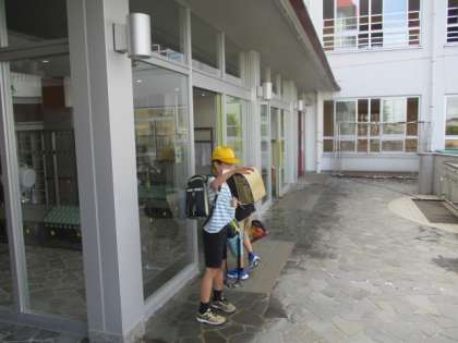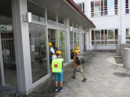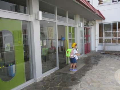 来年より早く富山県の梅雨明けを迎えました。今日の登校時間には既に日差しも強く、登校して来る児童たちも暑そうです。玄関先のミストの下では、登校した児童たちが涼を満喫しています。