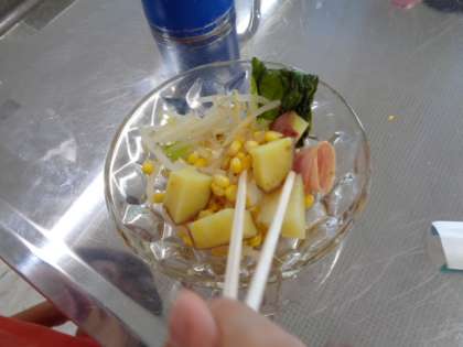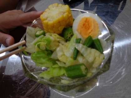 5年生は1・2時間目を使って調理実習に取り組みました。本日のレシピは「ゆで野菜サラダ」です。「ゆでる調理をしよう」という内容の学習です。材料は班の相談で決め、ゆでる時には固いものから順番にゆでていくことを学びました。