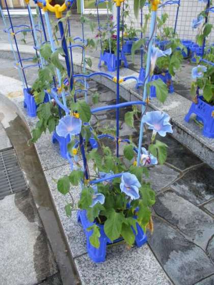 今朝、昨日以上に1年生のアサガオが花を付けました。ここのところの猛暑で毎日の水やりは欠かせませんが、こんなにたくさん花を付けてくれたアサガオのがんばりは立派です。中にはまだ花を咲かせていない鉢もありますが、この先きっとたくさんの花を咲かせてくれると思います。