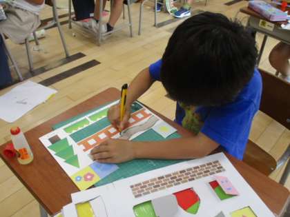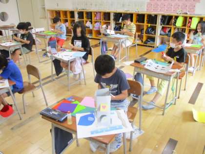 2年生の3時間目は図画工作の時間でした。この授業では「まどからこんにちは」という題で、厚紙などを使って立体的な工作をしています。