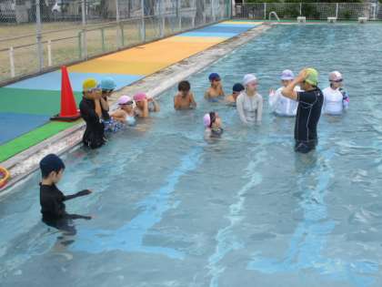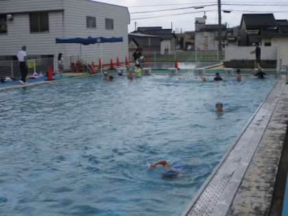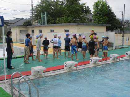 「滝修行?」を終え、プールに入ります。泳力に差があるようですので、その違いで2班に分かれて練習を開始しました。