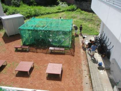 先週の金曜日、2年生が夏野菜を作っている畑が、またサルの襲撃を受けました。教頭先生が現場を確認しに行った時には、まだ子ザルが畑の囲いから逃げ出すことができず、母ザルと教頭先生とが遭遇したようです。ここのところ学校周辺の住宅地へえさを求めてやってくるサルですが、子どもたちは刺激しないように指導します。