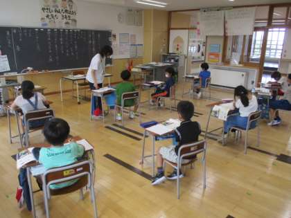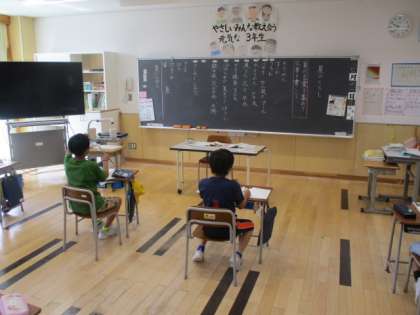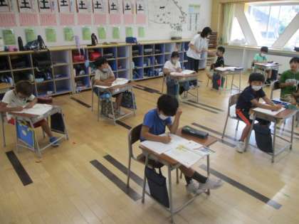 1時間目の3年生は国語の授業で、夏に関連する言葉を使って文章を作りました。そうめん、スイカ、うちわ、扇風機等々、子どもたちからはたくさんの言葉が出てきました。中には「蚊取り線香」という風流な言葉を出してくる児童もいました。