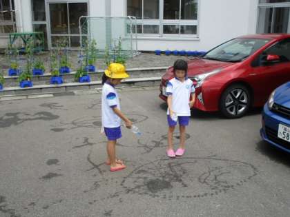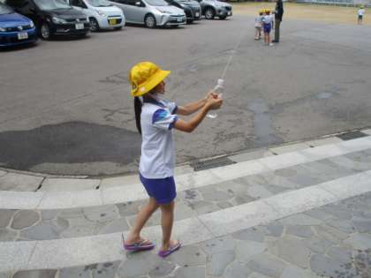 3時間目の1年生は生活科の授業でした。今日の課題は「夏の遊び」で、校舎外へ行って「水遊び」に興じました。中には羽目を外しすぎ、水をたくさん浴びた児童もいました。